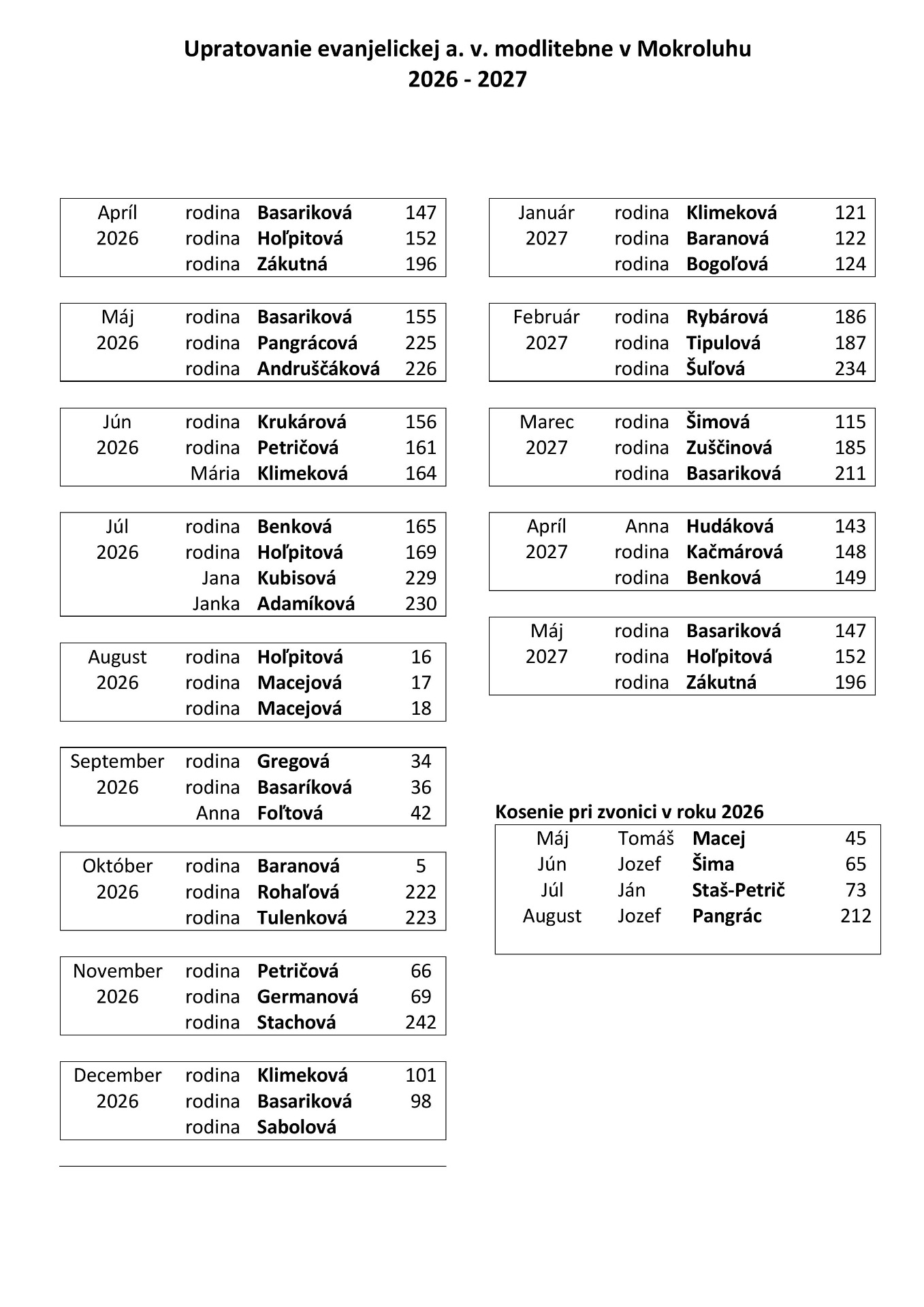 Rozpis upratovania ev. a. v. modlitebne v Mokroluhu